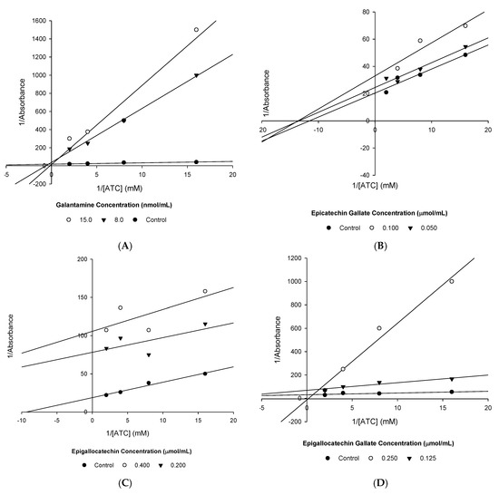 Lineweaver–Burk plots: (A) Gal, (B) ECG, (C) EGC and (D) EGCG.