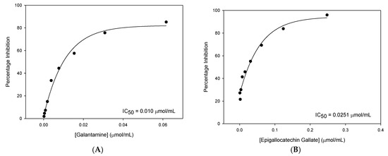IC50 plots for BuChE inhibition: concentration against percentage inhibition for each of the active compounds tested. (A) Gal and (B) EGCG.