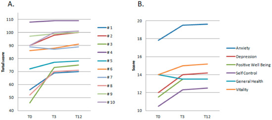 All patients completed the PGWBI health related quality of life test (Figure 1). The descriptive analysis showed that 3/10 patients presented at T0 with severe distress (total score 56, 46, and 52, respectively), 1/10 patients with a borderline-mild distress (total score 72), and 6/10 patients with positive well-being. After 3 months of LNAAs supplementation (T3), all patients showed an improvement of their general well-being, confirmed at the end of the study, despite the difference was not statistically significant (mean score ± SD: T0 78 ± 21; T3 87 ± 14; T12 88.4 ± 14). The improvement was more evident in those patients showing severe distress scores at T0: patient #1 improved his distress from severe to mild-moderate (Total score: T0 56, T3 69, T12 70) with better scores in the anxiety, self-control, general health, and vitality subscales; patient #3 improved from a severe distress to a positive well-being condition (Total score: T0 46, T3 73, T12 75) with relevant improvement in the depression, positive well-being, self-control, and vitality subscales; patient #8 improved from a severe to a mild distress condition (Total score: T0 52, T3 70, T12 71) with better rating in the anxiety, depression, positive well-being, and self-control subscales. Patient #5, presenting at T0 with a borderline-mild distress score (T0: 72), improved his perceived general well-being to a normal score (T3: 77, T12: 78) mainly due to better anxiety and vitality scores.