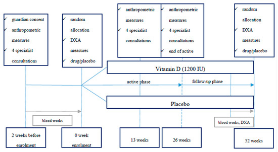The study period covered four appointments within the “6–10–14 for Health” obesity management program at the 0, 3, 6 and 12 month mark. All visits included individual meetings with a pediatrician, dietician, physical activity specialist and psychologist. All child/parent dyads had individual meetings with all 4 specialists—one directly after other. Detailed information about the program can be found in previous publications [36]. During the first appointment, the caregivers of all children were asked to provide written consent to the child taking part in the trial. Refusal to participate in the trial did not influence participation in the interventional obesity management program. Children with low blood concentration of 25(OH)D3 (<30 ng/ml) were referred for DXA (dual–energy x–ray absorptiometry) within two weeks from the starting visit.