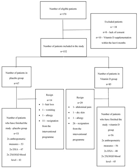A total of 170 patients were eligible for enrolment in the study during the enrolment period. A total of 152 patients were eventually included in the study (n = 8—no parental consent, n = 10—vitamin D intake during three months before the study). Subsequently the patients were randomly assigned to groups: 67 to the placebo group and 85 to the Vitamin D group. Out of the 152 qualified patients, 109 (72%) completed a full cycle of four visits scheduled in the program. In the placebo group, 64 patients completed the active phase of 26 weeks of supplementation, 53 completed the comprehensive treatment program (52 week duration).