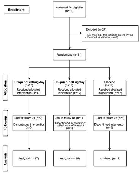 Participants were recruited from subjects referred as outpatients to the Clinical Laboratory of INRCA IRCCS and selected according to the above-listed inclusion and exclusion criteria. Those meeting the FMD criteria were enrolled and randomized according to a computer-generated randomized code into three groups who received: (i) ubiquinol 200 mg/day; (ii) ubiquinol 100 mg/day; and (iii) placebo. Dosages were chosen to reflect either the highest amount allowed in Italy and in several EU countries as a nutritional supplement (200 mg), and the amount of ubiquinol contained in many pharmacological formulations (100 mg). The three groups were matched for age, gender, LDL-C, and baseline FMD.