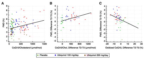 (A) Scatterplot showing the correlation between plasma coenzime Q10 (CoQ10) and flow-mediated dilation (FMD) for the pooled samples (n = 48 at each timepoint). (B,C) Scatterplots showing the correlations between the changes in FMD and (B) plasma CoQ10 or (C) oxidized CoQ10 at the three timepoints (n = 48).