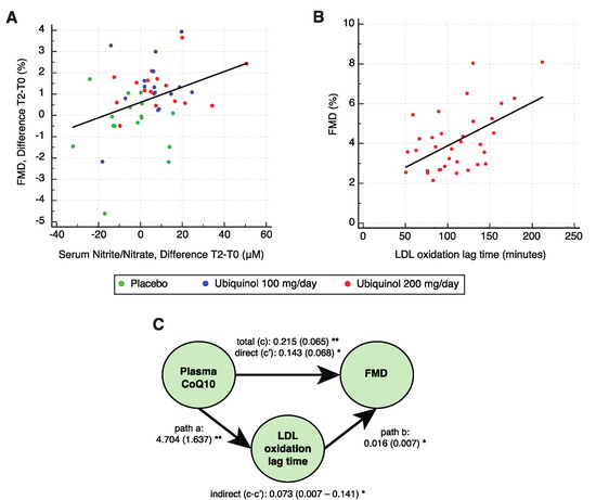 (A) Scatterplot showing the correlation between serum nitric oxide (NO) and FMD variations at the three timepoints (n = 48). (B) Scatterplot showing the correlations between low-density lipoprotein (LDL) oxidation lag time and FMD in the ubiquinol 200 mg/day group. (C) Results of mediation analysis of the effects of plasma CoQ10 on FMD mediated by LDL susceptibility to oxidation. *, p < 0.05; **, p < 0.01 for standardized bootstrapped (10,000 samples) total, direct, and indirect effect size. In brackets, are reported the standard errors for total and direct effects, and the 95% CI for indirect effect. The mediation procedure is described in Methods, paragraph 2.9.