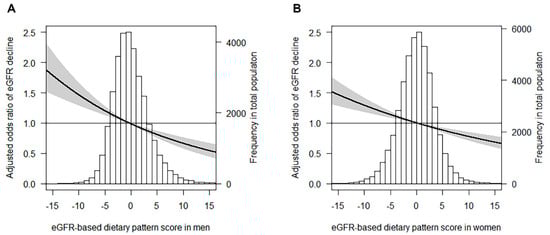 Adjusted odds ratio of a ≥20% eGFR decline in men and women. Data were fit by a multivariable logistic regression using the median value of eGFR-based dietary pattern score as the reference value (odds ratio = 1). The black line represents the adjusted odds ratio and the grey area represents the 95% confidence interval. Prevalent odds ratios of a ≥20% eGFR decline in men (A) or women (B) are shown, adjusted for age, BSA, BMI, waist circumference, cholesterol, triglycerides, diabetes, hypertension, cardiovascular disease, physical activity, smoker, total energy intake, education and income, and baseline eGFR.
