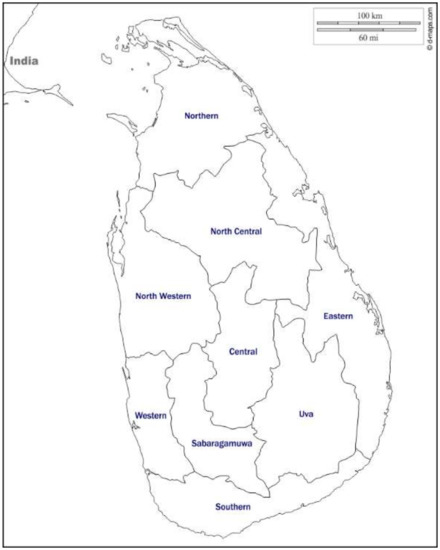 mUIC, TGRs, and HHIS were available for analysis from 4 national iodine surveys (NISs) between 2000 and 2016—NIS2000, NIS2005, NIS2010, and NIS2016 [13,14,15,16]. These NIS used a two-stage stratified cluster-sampling technique as specified by the WHO, UNICEF, and IGN [17,18]. During each NIS, the same team of field investigators visited all nine administrative provinces of the country to detect goitres by palpation, and collected urine from 6–12-year–old schoolchildren, and salt from their households and drinking-water samples from the household or school locality. Figure 1 illustrates the map of Sri Lanka demarcating 9 provinces. All four national studies were carried out to ascertain provincial variation. A total of 16,910 schoolchildren of 6–12 years of age were studied in the four surveys and included in the final analysis (Table 1). Furthermore, we had available data for analysis from the national micronutrient study in pregnant women in 2015 (MNSPM2015) (Table 2) [19].