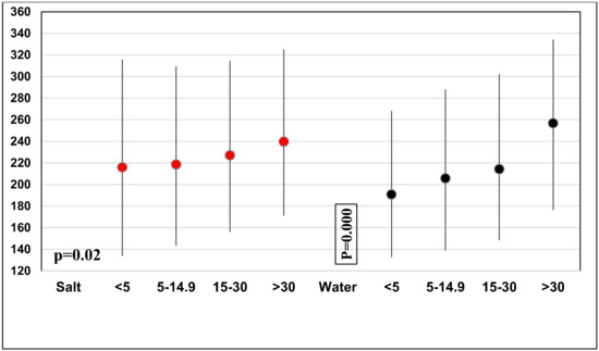 Figure 2 provides a graphical representation of the data on median UIC of children aged 6–12 years in 2016, stratified by the iodine content in HHIS and in drinking water. These data are noteworthy since the mUIC was within the optimal range in all subgroups, including those households of which the iodine content in HHIS was <5 ppm or in the range of 5–14.9 ppm, suggesting that the consumed iodine in HHIS is not the exclusive diet source of iodine. There was a significant increase in median UIC with increasing iodine concentrations in drinking water (p = 0.000).