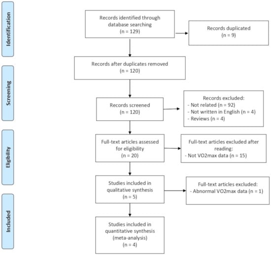 The PRISMA flow diagram is showed in Figure 1. A total of 129 records were identified, 9 of which were removed because they were duplicated. Of the remaining 120 articles, 92 were excluded because they were not related with the topic, 4 studies were not written in English, and 4 were reviews. After reading the remaining 20 articles, another 15 studies did not meet the inclusion criteria and were excluded. Therefore, 5 studies were included in the systematic review. However, the article by Sandhu et al. [] was excluded from meta-analysis due to the odd results. In this regard, they evaluated healthy young males and females aged between 18 and 25 with body mass index between 18 and 25. Their mean peak VO2max was lower than 14mL/kg/min, which is so much lower than expected for healthy young people and less than half the mean of the rest of the included studies (46.18 mL/kg/min). We tried to contact with the authors in order to obtain a reason for that, but at the time this article was considered for publication, we did not receive a response. Considering that in the article authors did not explain an incremental test to obtain the VO2max, we believe that they measured the gas exchange at rest, reporting the oxygen consumption (VO2). Therefore, this article was included in systematic review but not in the meta-analysis.