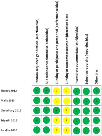 The quality of the evidence was categorized using the Grading of Recommendations, Assessment, Development and Evaluation (GRADE) approach. The risk of bias was assessed by the Cochrane Collaboration’s tool for assessing risk of bias. This tool classified the selection, performance, detection, attrition, and reporting bias into low, high, or unclear risk of bias.