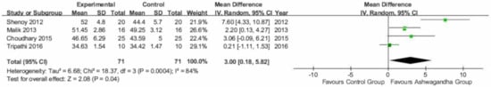 In spite of the relevant benefits of supplementation with Ashwagandha, only four meta-analyses have been carried out evaluating its efficacy on anti-inflammatory effects [], on impotence and infertility treatment [], on neurobehavioral disorders [] and anxiety []. However, there are no meta-analyses that analyze the effect of Ashwagandha on physical performance. Therefore, the purpose of this study was to systematically review the scientific literature about the effects of supplementation with Ashwagandha on VO2max and to provide practical recommendations. Besides, a meta-analysis was carried out to determine the effect sizes of Ashwagandha on VO2max.