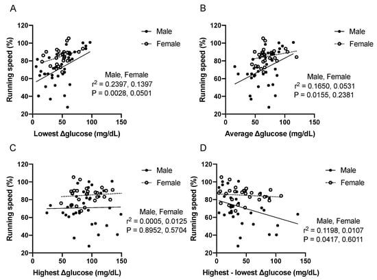 Scatter plots showing relationships between glucose level and running speed. The lowest (A), average (B), highest (C), and difference between highest and lowest (D) value of Δglucose levels were calculated as described in Figure 1. Each plot indicates one segment.