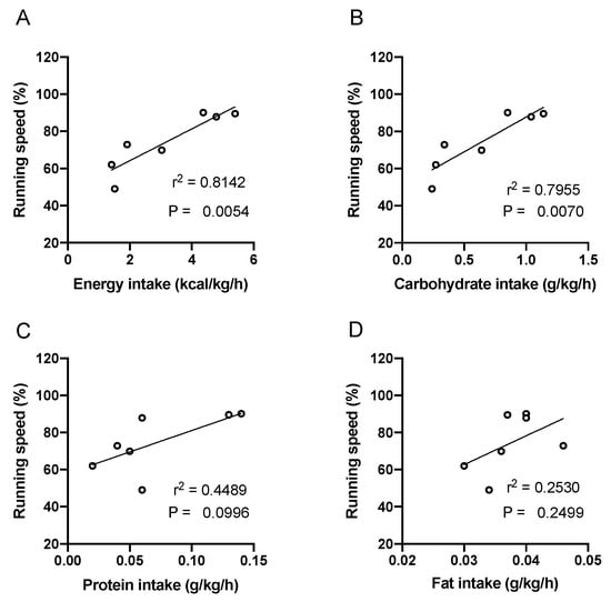 Scatter plots showing relationships between nutrient intake and running speed. The intake of energy (A), carbohydrate (B), protein (C), and fat (D) were calculated based on consumed food products and fluids. Each plot indicates one runner.