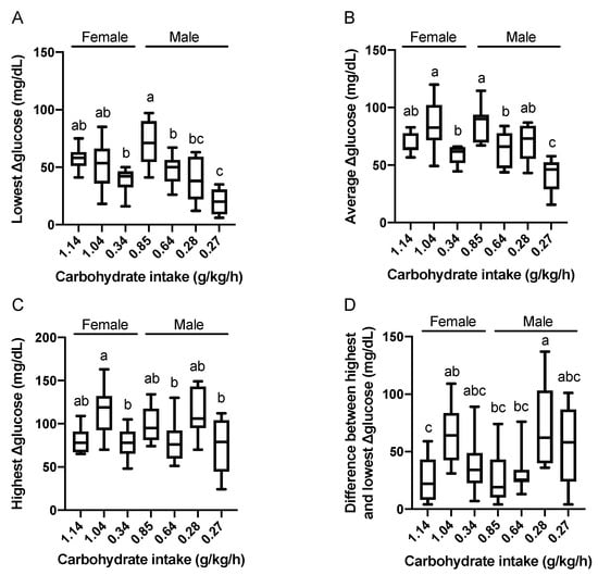 Relationships between carbohydrate intake and the lowest (A), average (B), highest (C), and the difference between the highest and lowest (D) value of Δglucose levels. Carbohydrate intake of each runner is expressed in the X-axis. Data are expressed using box-and-whisker plots to indicate the minimum, first quartile, median, third quartile, and maximum. Bar height indicates the average of the dots. Values without common superscript are significantly different, P < 0.05