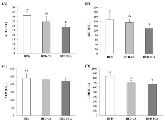 Serum alanine aminotransferase (ALT) (A), aspartate aminotransferase (AST) (B), alkaline phosphatase (ALP) (C), and lactate dehydrogenase (LDH) (D) activities in rats fed experimental diets for eight weeks. Values are mean ± SE (n = 8). a,b; Bars with different letters are significantly different at p < 0.05 by Tukey’s test. NS: No significance. Diet groups; HFD, high fat diet group: HFD-CA, HFD + cabbage-apple juice administration group: HFD-FCA, HFD + fermented cabbage-apple juice administration group.