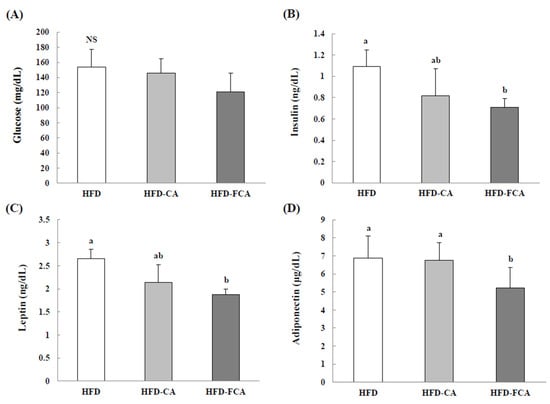 Glucose (A), insulin (B), leptin (C), and adiponectin (D) levels in serum of rats fed experimental diets for eight weeks. Values are mean ± SE (n = 8). a,b; Bars with different letters are significantly different at p < 0.05 by Tukey’s test. NS: No significance. Diet groups; HFD, high fat diet group: HFD-CA, HFD + cabbage-apple juice administration group: HFD-FCA, HFD + fermented cabbage-apple juice administration group.