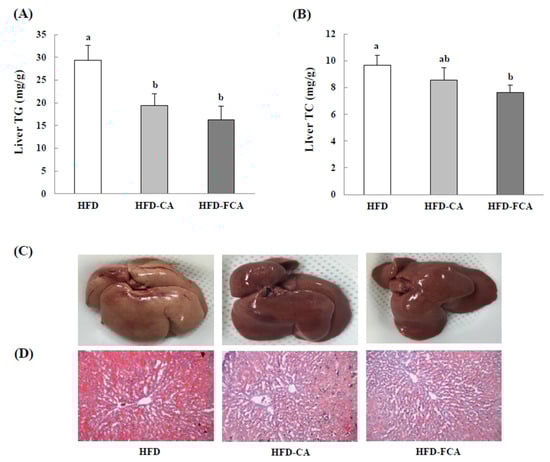 Hepatic triglyceride (A) and total cholesterol (B) levels, representative anatomical views (C), and histopathological analysis (D) in rats fed experimental diets for 8 weeks. All sections were stained with Oil Red O, ×100. Values are mean ± SE (n = 8 rats per group). a,b; Bars with different letters are significantly different at p < 0.05 by Tukey’s test. Diet groups; HFD, high fat diet group: HFD-CA, HFD + cabbage-apple juice administration group: HFD-FCA, HFD + fermented cabbage-apple juice administration group.