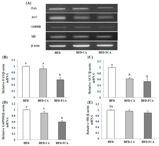 mRNA expression levels of enzymes related to lipid synthesis (A) in livers of rats fed experimental diets for eight weeks. The mRNA expression levels of FAS (B), ACC (C), G6PDH (D), and malic enzyme (ME) (E) were measured by RT-PCR. In the determination of mRNA levels, β-actin served as a loading control. Values are mean ± SE (n = 8 rats per group). a,b; Bars with different letters are significantly different at p < 0.05 by Tukey’s test. Diet groups; HFD, high fat diet group: HFD-CA, HFD + cabbage-apple juice administration group: HFD-FCA, HFD + fermented cabbage-apple juice administration group.