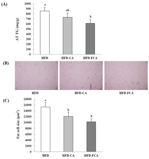 The TG content in the epididymal adipose tissue decreased in the HFD-juice supplemented groups (HFD-CA and HFD-FCA) by approximately 14.2–28.2% as compared to the HFD group (Figure 6). When the size of epididymal adipocytes was measured, HFD displayed a marked increase in size; however, a decrease in size in the HFD-juice supplemented groups (HFD-CA and HFD-FCA) when compared to the HFD group was shown in the HFD-juice supplemented groups (HFD-CA and HFD-FCA). HFD-FCA, in particular, showed a significantly reduced adipocyte size when compared to HFD-CA.
