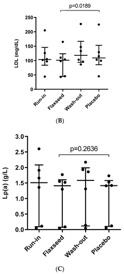 All statistical analyses were performed using GraphPad Prism 8.0 (GraphPad Software, La Jolla, CA, USA). Normality of the data distribution was tested with the Shapiro–Wilk’s test. Since the data did not follow a Gaussian distribution, they were analyzed with the nonparametric Friedman test with the Dunn post hoc test for comparisons between the treatments with flaxseed and placebo. The results are presented as individual data with the medians and interquartile ranges indicated. A value of p < 0.05 was considered significant.
