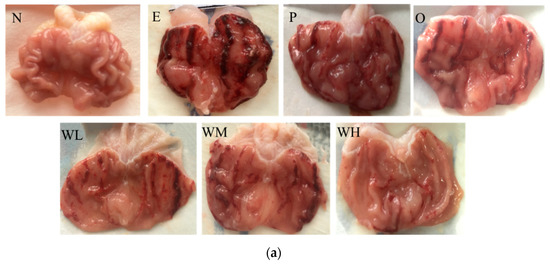 As shown in Figure 1a, no visible lesion exhibited in the stomach of rats in the normal group, the surface of the stomach was pink, and the gastric mucosa was smooth, intact, and regular (group N). Rats in six groups administrated with absolute ethanol at 5 mL/kg displayed varying degrees of hemorrhagic gastric lesions and the incidence rate of injury was 100%, indicating that ethanol has caused gastric mucosa injury successfully (group E~WH). Rats in ethanol group suffered the most severe gastric mucosal damage with a wide range of lesions appearing as extended hemorrhagic bands (group E), while the whey protein group (group P) and omeprazole group (group O) revealed mild damage compared with ethanol group. However, WOPs administration groups (group WL, WM and WH) exhibited moderate to slight gastric mucosa injuries in comparison with ethanol group, and among three WOPs groups, the gastric mucosa injuries of rats in the WOPs-HG (880 mg/kg body weight) group were the least severe and remarkably better than in whey protein group and omeprazole group.