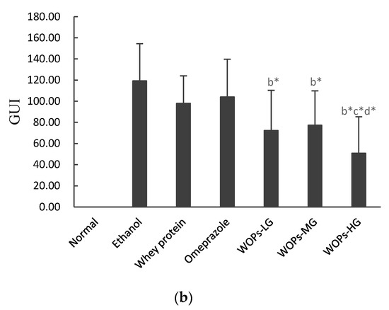 The results presented in Figure 1b illustrated that the gastric ulcer index (GUI) substantially increased of rats in the ethanol group. The administration with WOPs significantly reduced GUI in comparison with the ethanol group (p < 0.05). Gastric mucosa of rats in the WOPs-HG (880 mg/kg body weight) was mainly spotted hemorrhage, its GUI was distinctly lower than that of whey protein group and the omeprazole group (p < 0.05). However, the GUI of rats in the omeprazole group and whey protein group was lower than that of the ethanol group, but the difference was not significant (p > 0.05). The intervention dose of omeprazole positive control group was converted according to the recommended dosage to body weight ratio according to the drug instructions [4].