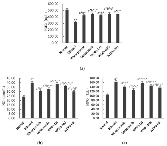 Figure 2. Effects of WOPs on gastric PGE2 (a), NO (b), and MPO (c) levels in ethanol-induced rats. Values were expressed as mean ± SD (n = 10); a, b, c, d means compared with normal group, ethanol group, whey protein group, and omeprazole group separately; * p < 0.05 was considered to have statistical differences. PGE2, prostaglandin E2; NO, nitric oxide; MPO, myeloperoxidase. WOPs-LG, 220 mg/kg of walnut oligopeptides group; WOPs-MG, 440 mg/kg of walnut oligopeptides group; WOPs-HG, 880 mg/kg of walnut oligopeptides group.