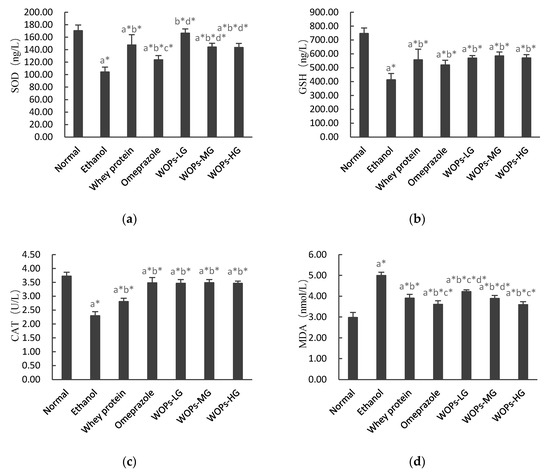 Figure 3. Effects of WOPs on SOD (a), GSH (b), CAT (c), MDA (d) levels in ethanol-induced rats. Values are presented as mean ± SD (n = 10); a, b, c, d means compared with normal group, ethanol group, whey protein group, and omeprazole group separately; * p < 0.05 was considered to have statistical differences. SOD, superoxide dismutase; GSH, reduced glutathione; CAT, Catalase; MDA, malondialdehyde; WOPs-LG, 220 mg/kg of walnut oligopeptides group; WOPs-MG, 440 mg/kg of walnut oligopeptides group; WOPs-HG, 880 mg/kg of walnut oligopeptides group.