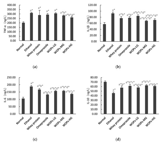 Figure 4. Effects of WOPs on TNF-α (a), IL-1β (b), IL-6 (c), and IL-10 (d) levels in ethanol-induced rats. Data are expressed as mean ± SD (n = 10); a, b, c, d represent compared with normal group, ethanol group, whey protein group, and omeprazole group, respectively; * p < 0.05 was considered to have statistical differences. Tumor necrosis factor α, TNF-α; interleukin (IL)-6, IL-6; interleukin (IL)-1β, IL-1β; IL-10, interleukin (IL)-10; WOPs-LG, 220 mg/kg of walnut oligopeptides group; WOPs-MG, 440 mg/kg of walnut oligopeptides group; WOPs-HG, 880 mg/kg of walnut oligopeptides group.