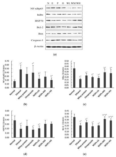 Figure 5. Effect of WOPs on the apoptosis-related protein expression in rats. (a) Apoptosis-related protein levels were analyzed by Western blot. N, normal control group; E, ethanol group; P, whey protein group (220 mg/kg body weight); O, omeprazole group (20 mg/kg body weight); WL, WOPs-LG (220 mg/kg body weight); WM, WOPs-LG (440 mg/kg body weight); WH, WOPs-HG (880 mg/kg body weight). (b) Effect of WOPs on the expression of NF-κB p65 in gastric tissue of rats. (c) Expression of IκBα in gastric tissue of rats. (d) Expression of HSP70 in gastric tissue of rats. (e) Expression of Bcl-2 in gastric tissue of rats. (f) Expression of Bax in gastric tissue of rats. (g) Expression of Caspase-3 in gastric tissue of rats. Data are expressed as mean ± SD (n = 10); a, b, d represent compared with the normal group, ethanol group, and omeprazole group separately; * p < 0.05 was considered to have statistical differences. NF-κB p65, nuclear factor-κB p65; IκBα, inhibitor kappa Bα; WOPs-LG, 220 mg/kg of walnut oligopeptides group; WOPs-MG, 440 mg/kg of walnut oligopeptides group; WOPs-HG, 880 mg/kg of walnut oligopeptides group.