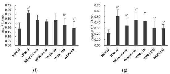 The data presented in Figure 5e–g showed that the gastric mucosa of rats in ethanol group had significant apoptosis damage, which was exhibited by the down-regulation of anti-apoptosis protein Bcl-2 and up-regulation of the pro-apoptotic proteins Bax and caspase-3 (p < 0.05), while no significant difference was observed in whey protein group or omeprazole group in comparison with those in ethanol group (p > 0.05). Nevertheless, the expression of Bcl-2 was significantly up-regulated, while Bax and caspase-3 were markedly down-regulated of rats in WOPs-MG and WOPs-HG groups when compared with the ethanol group (p < 0.05), which indicated that WOPs intervention can alleviate the gastric mucosal apoptosis induced by ethanol to a certain extent. Besides, the expression of Bcl-2 in WOPs-MG and WOPs-HG groups were higher than those of omeprazole group (p < 0.05), whereas the expression of Bax and caspase-3 between WOPs groups and omeprazole group did not differ significantly (p > 0.05).