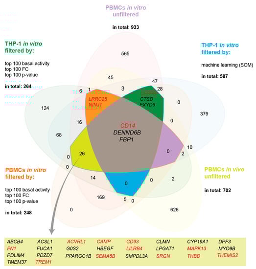 In order to identify common vitamin D target genes in immune related cell types, we used the results of three different RNA-seq datasets. These were from THP-1 cells, which had been treated in three biological repeats for 24 h with 10 nM 1,25(OH)2D3 [29]; PBMCs of 12 healthy individuals, which were stimulated in vitro in a single repeat for 24 h with 10 nM 1,25(OH)2D3 [31]; and PBMCs of five healthy individuals, which had been supplemented once for 24 h with a vitamin D3 bolus of 2000 µg [30]. The THP-1 dataset was filtered by the machine learning method self-organizing map (SOM) [28] or for the top 100 genes with respect to basal activity, FC or p-value [33], which provided 587 and 264 target genes, respectively (Figure 1). Similarly, in vitro treated, unfiltered PBMCs showed 933 target genes or 248 genes after filtering for the top 100 genes with respect to basal activity, FC or p-value. In vivo PBMCs reported 702 vitamin D target genes. A Venn diagram of these five gene lists highlighted the genes CD14 (CD14 molecule), DENND6B (DENN domain containing 6B) and FBP1 (fructose-bisphosphatase 1) as common targets. However, under the condition that only four of five datasets need to overlap, a further 31 genes were identified.