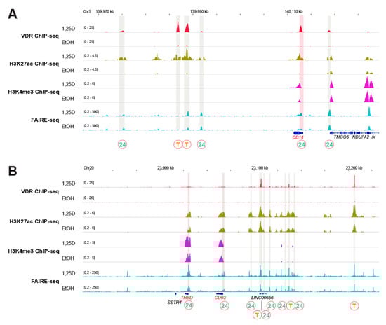 The CD14 gene (Figure 2A) is a master example of the first epigenome group being regulated by a ligand-dependent super-enhancer (T-T-24), which is located some 25 kb downstream of the TSS. The two strong transient VDR binding sites as well as the H3K27ac signal of active chromatin throughout the whole super-enhancer are significantly (p < 0.05) affected by ligand. Moreover, 1,25(OH)2D3-dependent binding of VDR as well as of H3K27ac and H3K4me3 markers were detected at the TSS region of the gene. The genes NINJ1 (Figure A1A) and THEMIS2 (Figure A1B) are additional members of this epigenome group with ligand-dependent super-enhancers (P-T-24 and P-24-24) but non-ligand-dependent TSS regions.