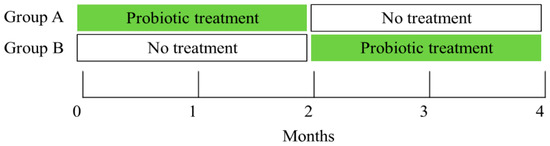 At enrollment, study participants were instructed to take no other probiotic products. Group A received two oral capsules/day each containing 5 × 109 L. rhamnosus GR-1 and L. reuteri RC-14 (CHR. HANSEN, Denmark) for two months, while group B received no treatment for two months. Afterwards, the groups were crossed over and group B received the probiotic capsules while group A received no treatment for an additional two months. L. rhamnosus GR-1 and L. reuteri RC-14 were selected because they originate from the female urogenital tract, colonize the vagina, and can inhibit the growth and adhesion of urogenital pathogens [17]. Assessing subjective complaints on vaginal symptoms, a per-speculum vaginal examination, pH evaluation with vs. sense (Common sense Ltd., Israel) and pH indicators (SIGMA, ST. Louis, MO, USA), as well as vaginal swabbing for Nugent scores, were performed at baseline and every month, throughout the four-month study period. Vaginal samples, also collected monthly, were cultured for the detection of bacteria contained in the capsules, identified by matrix-assisted laser desorption/ionization time-of-flight mass spectrometry (MALDI TOF-MS; described in details in the following section) following culture on selective media. A diagram of the treatment and assessment schedule is presented in Figure 1.