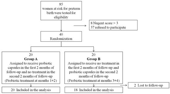 Assuming a 75% and 25% detection rate of the lactobacilli from the probiotic capsules during the first two months of follow-up in the treatment (group A) and no-treatment (group B) groups, respectively, 15 women were required for each group (+5 women per group for cases of drop out, 5% 2-sided alpha, 80% power). Groups’ subject characteristics and endpoints were compared using Student’s t-test (or the Wilcoxon two sample test) for continuous variables and χ2 (or Fisher’s exact test) for categorical variables. Analysis was performed according to the intent-to-treat principle. The statistical analyses were performed using SAS 9.4 software (SAS Institute Inc., Cary, NC, USA.). Statistical significance was determined when p < 0.05.