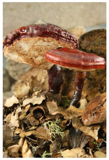 Ganoderma lucidum (Curtis) P. Karst. (Ganodermataceae Polyporales) [,] is an annual wood-degrading Basidiomycota (Figure 1) that is frequently dimidiate, in the form of a stipulated shelf, hat or pileus of 40–200 (300) mm in diameter, irregularly rounded, oval, reniform or flabeliform (fan-shaped), and is frequently stipulated centrally or laterally. Table 1 shows some common names [].