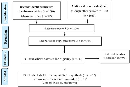 PRISMA (Preferred Reporting Items for Systematic Reviews and Meta-Analyses) flow diagram for studies retrieved through the searching and selection process. * The reasons for the exclusion of articles were the lack of critical information and methodological shortcomings (see Methods section).