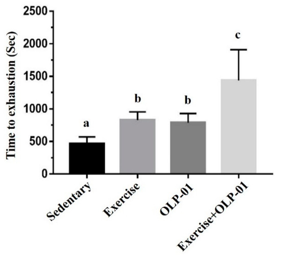 | Parameter | Sedentary | Exercise | OLP-01 | Exercise + OLP-01 |
