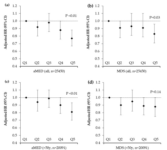 Total fracture risk after a mean follow up of 17.6 years by quintile of alternative Mediterranean Diet Score and Mediterranean Diet Score in 25,450 men and women aged 39–79 years stratified by age. Values are adjusted hazard ratios (95% CI), n = 25,450. Ratios were adjusted for sex, age, BMI, smoking, physical activity, family history of osteoporosis, calcium intakes, supplement use (vitamin D or calcium), medication use (corticosteroids, aspirin or hormone replacement therapy), menopausal status, days of dietary intake data and the ratio of energy intake to estimated energy requirements. p values are for trends calculated using the Cox proportional hazards model. Participant numbers (cases) per quintile were as follows; (a) aMED all participants: Q1 = 5161 (481), Q2 = 4991 (430), Q3 = 5557 (515), Q4 = 4740 (396), Q5 = 5001 (373) (b) MDS all participants: Q1 = 3304 (317), Q2 = 4779 (416), Q3 = 5918 (528), Q4 = 5681 (494), Q5 = 5768 (440) (c) aMED participants >50 years: Q1 = 4151 (446), Q2 = 3983 (401), Q3 = 4422 (470), Q4 = 3688 (364), Q5 = 3847 (339) (d) MDS participants >50 years: Q1 = 2641 (296), Q2 = 3848 (380), Q3 = 4668 (495), Q4 = 4478 (436), Q5 = 4456 (413). aMED = alternative Mediterranean Diet Score, MDS = Mediterranean Diet Score.