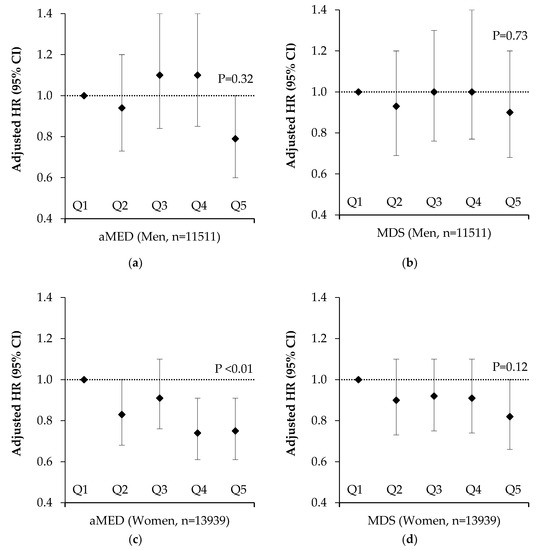 After stratification by sex, these associations were only apparent in women (Q5 vs. Q1 HR 0.75; 95% CI 0.61, 0.91; p-trend < 0.01) (Figure 4). In analysis restricted to participants aged over 50 years, who experienced 92% of fractures, we observed a significant inverse trend for reduced fracture risk by higher aMED score (Q5 vs. Q1 HR 0.83; 95% CI 0.72, 0.95; p-trend < 0.01) (Figure 3). Likewise, we observed a significant trend for reduced fracture risk by higher aMED score in post-menopausal women (Q5 vs. Q1 HR 0.85; 95% CI 0.71, 1.02; p-trend = 0.04) (Figure S1). The unadjusted hazard ratios for all participants by Mediterranean Diet adherence are presented in Figure S2. Higher adherence to the MDS was also associated with reduced fracture risk in the whole cohort (Q5 vs. Q1 HR 0.83; 95% CI 0.71, 0.96; p-trend = 0.03), there were no associations with MDS when the cohort was stratified by sex or age. For hip fracture, we found a significant inverse trend for aMED (Q5 vs. Q1 HR 0.79; 95% CI 0.65, 0.96; p-trend = 0.01) but not MDS (Q5 vs. Q1 HR 0.85; 95% CI 0.69, 1.04; p-trend = 0.24) adherence (data not shown).