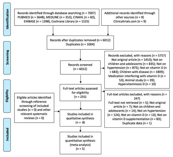 Preventing vitamin D deficiency or correcting it through supplementation could be of public health relevance, especially since it is an inexpensive intervention already used in children and adolescents to improve bone health. This study aims to systematically review the literature on the relationship between vitamin D supplementation and BP in children and adolescents, and meta-analyze available data.