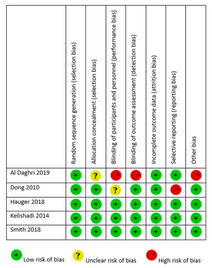 The quality of the design and reporting of RCTs was variable, as presented in Figure 3. All studies reported random allocation, but there was insufficient detail given to ascertain adequate allocation concealment in another two studies (those by Dong et al. [29] and Al Daghri et al. [28]). All studies mentioned withdrawals and reasons for withdrawal along with dropout numbers. All trials had adequate blinding of participants and personnel, except those by Dong et al. [29] and Al Daghri et al. [28], and all reported blinding of outcome assessment. Finally, in the study by Dong et al., endline BP values were not presented [21].