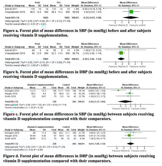 As for the RCTs, none of the studies reported significant changes in either SBP or DBP over time, in intra- or inter-group comparisons, except Al Daghri et al. [28]. In this study, a significant change in BP was noted; the authors reported a significant decrease in SBP over time in all the study groups, including the control group, with a significant inter-group difference in favor of the vitamin D tablet group. Also, Al Daghri et al. reported a significant decrease in DBP over time in both the vitamin D tablet and control groups [28]. This was a significant inter-group difference in favor of the control group. Similarly, the prevalence of elevated BP decreased significantly in the vitamin D tablet and control groups, from 38.9% to 25%, and from 34.9% to 24.7%, respectively.