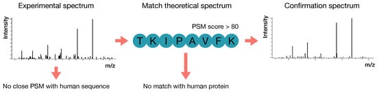 Schematic overview of the workflow used for confirmation of the identified nonhuman peptide sequences. After LC-MS/MS analysis, experimental MSMS spectra that matched theoretical nonhuman peptide sequences were selected when there was no close peptide sequence match (PSM) with a human peptide sequence. Spectra with a PSM score < 80 or a full match with the human proteome were removed. The final remaining spectra were confirmed with retention time and MSMS spectra of bovine milk, pure proteins, or synthetically acquired peptides.