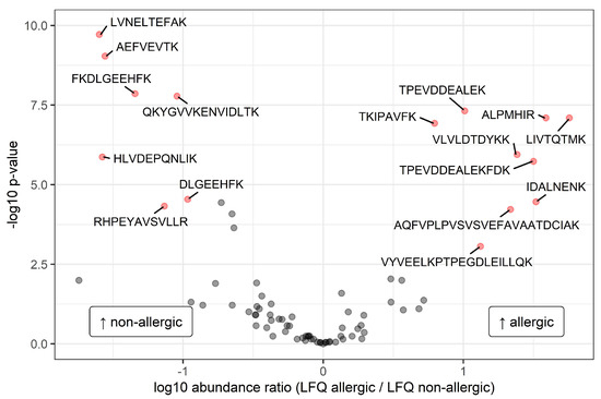Volcano plot with the ratios of the group means of the 10log transformed label-free quantification (LFQ) intensities of the identified peptide sequences. Significantly different peptides (false discovery rate < 0.01 and difference between groups > ±0.75) are represented by filled red circles and labelled with the corresponding amino acid sequence. On the right side of the plot, the peptides with a higher level in allergic mothers are presented, and on the left side, the peptides with a higher level in nonallergic mothers are presented.