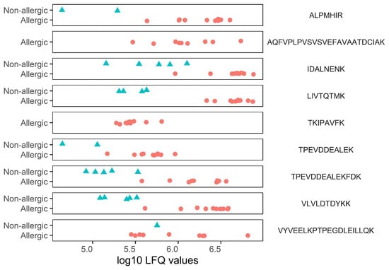 Categorical scatterplot showing non-imputed, 10log transformed LFQ intensities of peptide sequences that were found in significantly higher levels in milk from allergic mothers. Allergic mothers are represented by red circles, and nonallergic mothers are represented by blue triangles.