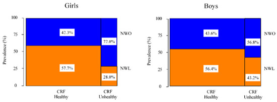 Mosaic plot depicting the frequency of participants (%) in each obesity group (normal-weight lean (NWL), normal-weight obesity (NWO)), cardiorespiratory fitness (CRF) categories (healthy, unhealthy) by sex. NWO was defined as a BMI < 25 kg/m2 and a percentage of body fat over the sex-age-specific 90th percentile for Colombian children and adolescents (boys > 23.4%–28.3% and girls > 31.0%–34.1%) []. CRF were grouped into two groups (i.e., healthy and unhealthy) according to previously suggested cut-off points associated with high cardiovascular disease risk in Colombian children and adolescents []. These cut-off points were defined as < 47.9 mL·kg−1·min−1 in boys and < 34.4 mL·kg−1·min−1 in girls aged 9–12.9 years, and < 48.0 mL·kg−1·min−1 in boys and < 33.8 mL·kg−1·min−1 in girls aged 13–17.9 years, respectively.