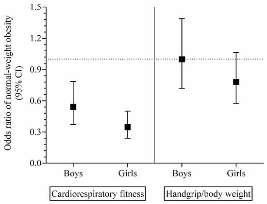 Finally, the adjusted odds ratios (ORs) to be classified as NWO according to physical fitness parameters (CRF and handgrip strength/body weight) categories are shown in Figure 2. For both sexes, the prevalence of NWO was lower in youths classified with healthy CRF levels (boys, OR = 0.54, 95% CI 0.37 to 0.78; girls, OR = 0.35, 95% CI 0.24 to 0.50) (p < 0.001) compared to unhealthy peers.