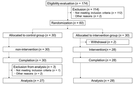Sixty eligible participants were randomly assigned to two groups by the stratified permuted block randomization method. The assignment factors were age, sex, fasting blood glucose level, and systolic blood pressure. The two groups either drank two 550 mL bottles of water per day in addition to their usual fluid intake (intervention group) or drank no additional fluids (control group). After allocation, two participants were withdrawn from intervention group. Fifty-seven subjects participated in the test period.