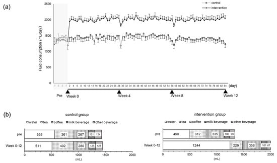 An open-label, two-arm, randomized controlled trial was conducted for 12 weeks. Two additional 550 mL bottles of water on top of habitual fluid intake were consumed in the intervention group. The subjects drank one bottle of water (550 mL) within 2 h of waking, and one bottle (550 mL) 2 h before bedtime. Subjects increased mean fluid intake from 1.3 L/day to 2.0 L/day.