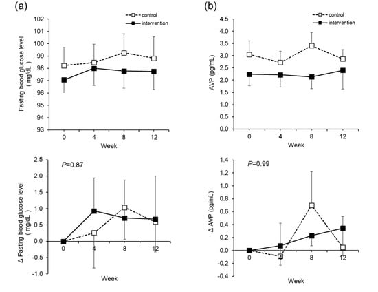 38], which may be reversed by the water-induced reduction of AVP. However, the initial AVP level in the intervention group was 2.2 ± 2.3 pg/mL, which was low for the subject at baseline. It is surmised that as this subject did not have a fluctuating range of AVP, there was no impact on the blood glucose level either. In an ongoing study in Europe, which involves subjects with low water intake and high concentrations of copeptin, an alternative marker for AVP, hydration (a 1.5 L increase in daily water intake) vs. control therapy (no change in water intake) will be tested, with the difference in fasting plasma glucose as the primary outcome (NCT03422848). In this manner, when the study is limited to people with high AVP, intervention by water intake may decrease the blood glucose level, but this study involved people just with high blood glucose levels, and there was no blood glucose-reducing effect. On the other hand, other blood glucose profiles, such as HbA1c and GA, decreased significantly in the intervention group. Since HbA1c provides a more accurate overall picture of what our average blood sugar levels have been over a period of weeks/months, these data could be reflective of improvements to glucose metabolism due to the effects of continued daily water supplementation. With regard to the influence on glucose metabolism with a conditional effect, it is necessary to conduct further studies under separate conditions, such as in the study in Europe (NCT03422848).